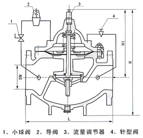 調(diào)節(jié)針閥開(kāi)度和調(diào)節(jié)導(dǎo)閥彈簧壓力,即可使主閥開(kāi)度保持在設(shè)定開(kāi)度,并在壓力變化時(shí)導(dǎo)閥進(jìn)行自動(dòng)調(diào)節(jié),保持流量不變。